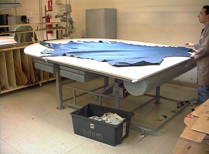 Costruito per offrire le migliori condizioni di lavoro al personale addetto al taglio delle pelli nell’industria del salotto, evitando difficoltà riguardanti la stesura ed il controllo del manto, consentendo all’operatore di regolarlo anteriormente e/o posteriormente secondo le proprie esigenze lavorative.